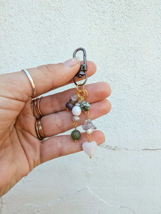 Bag Charm - Mossy - Moss Jasper, Pearl, Rose Quartz Faceted Heart