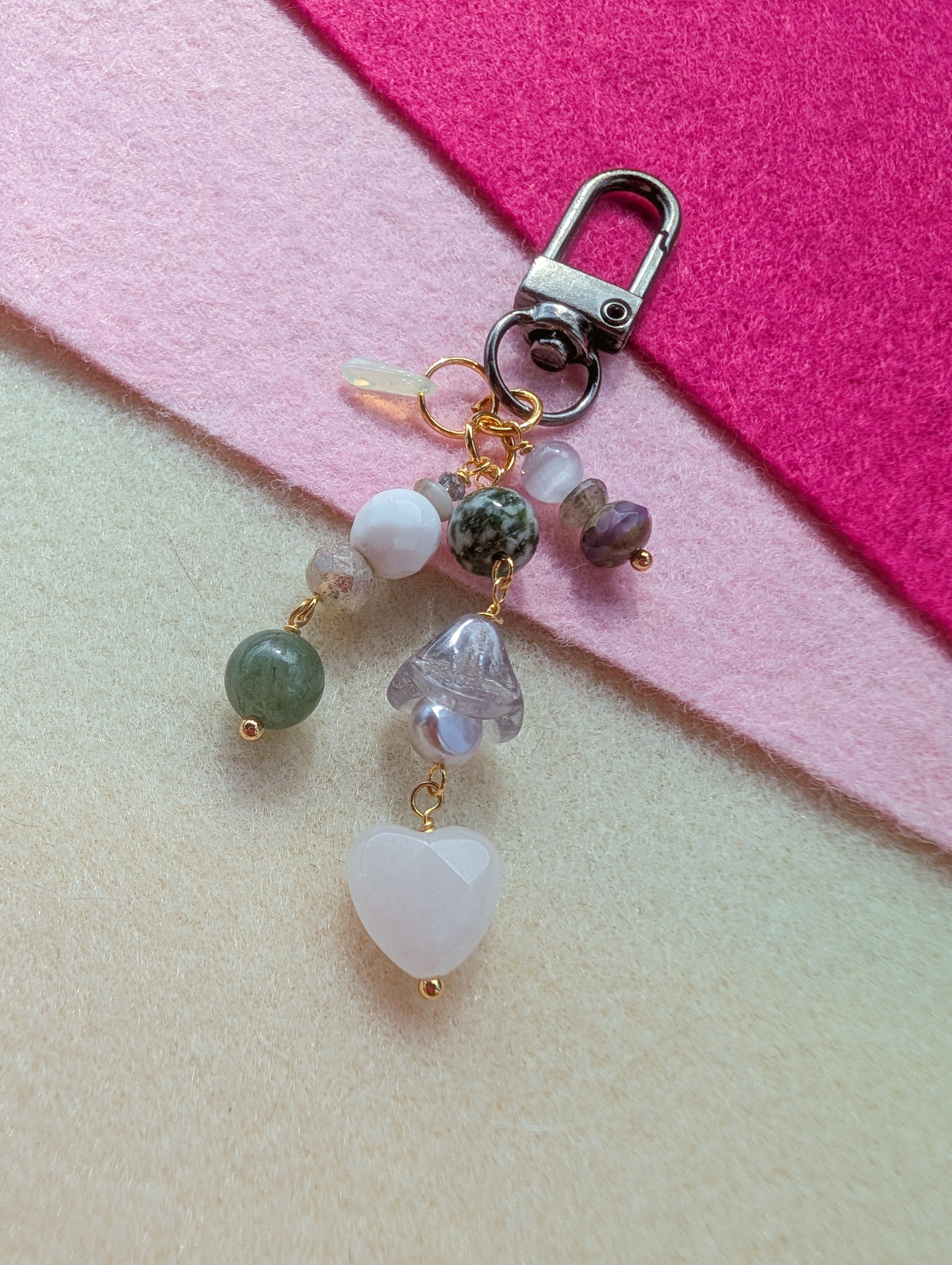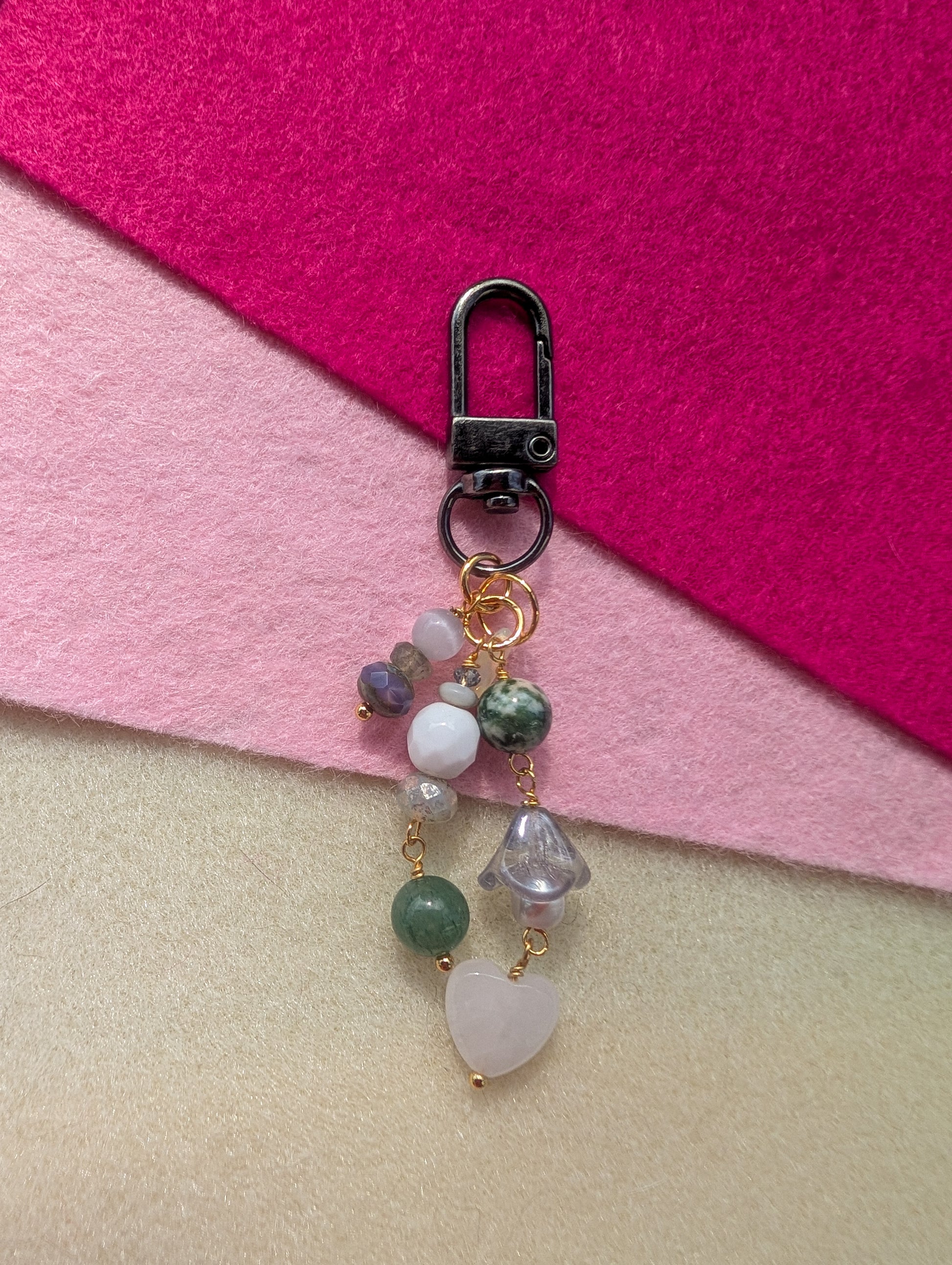 Bag Charm - Mossy - Moss Jasper, Pearl, Rose Quartz Faceted Heart